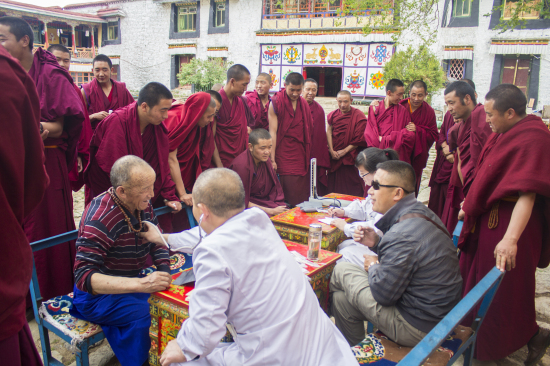 義診現(xiàn)場,醫(yī)療隊熱情接待每一位前來就診或咨詢的僧侶,為其看病、發(fā)放藥品及講解日常健康知識和自我保健的方法,僧侶們也由一開始的只是駐足觀望轉(zhuǎn)為積極上前就診,并主動向醫(yī)療隊闡述自己的病狀,同時針灸科李泉濤醫(yī)生更是不間斷地為多位經(jīng)常久坐寺中的僧侶推拿與按摩頸、肩、腰、腿等各個部位。中午時分,醫(yī)療隊還受邀與僧侶們一起吃齋飯。