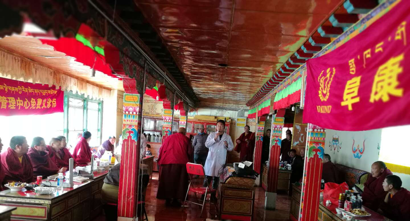 隨后,義診活動井然有序地開始了,張?jiān)洪L和田豐輝醫(yī)生負(fù)責(zé)測血壓,護(hù)士唐宗青測血糖,瓊瑪負(fù)責(zé)發(fā)放藥品,占堆(我院體檢中心醫(yī)務(wù)人員)對每一位血壓、血糖高的僧人、群眾進(jìn)行登記,有利于以后對他們的健康進(jìn)行隨訪跟蹤,了解他們有無不適以及血壓、血糖情況,督促他們的按時(shí)服藥、并指導(dǎo)他們健康的生活方式。在義診體檢過程中,一名76歲的老人,血壓200/120mmHg,經(jīng)過詢問,老人身體并沒有不適,在詳細(xì)的給老人講解了高血壓對身體健康的影響,以及高血壓帶來的危害后,并給予老人免費(fèi)發(fā)了治療高血壓的藥物,囑咐他這幾天要每天規(guī)律服用降壓藥物、監(jiān)測血壓,直至血壓在正常范圍后可以改為三到五天測一次血壓,但降血壓藥物不能停止,老人欣然接受意見,并握手致謝。