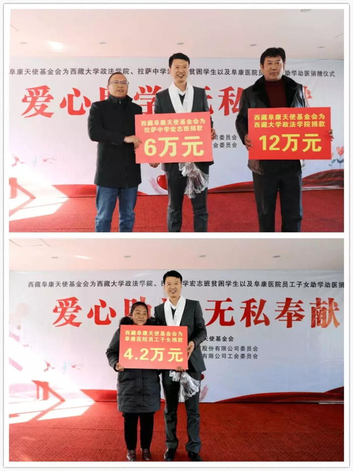 本次捐贈(zèng)儀式,西藏阜康天使基金會(huì)為西藏大學(xué)政法學(xué)院30名貧困學(xué)生,每人每年捐助4000元的生活補(bǔ)貼,總金額為120000元人民幣;為拉薩中學(xué)宏志班10名學(xué)生,每人每年6000元的生活補(bǔ)貼,總金額60000元人民幣;為阜康醫(yī)院內(nèi)部6名貧困員工的子女(4名助學(xué);2名助醫(yī))給予助學(xué)助醫(yī)補(bǔ)助,每人每年6000元,總金額36000元人民幣。為社會(huì)學(xué)生2名(1名高中生、1名大學(xué)生);每人6000元,共計(jì)12000元人民幣。此次捐贈(zèng)總金額為228000元人民幣。此外阜康醫(yī)院還分別為西藏大學(xué)政法學(xué)院20名和拉薩中學(xué)20名身體存在健康隱患的學(xué)生開通綠色體檢通道。