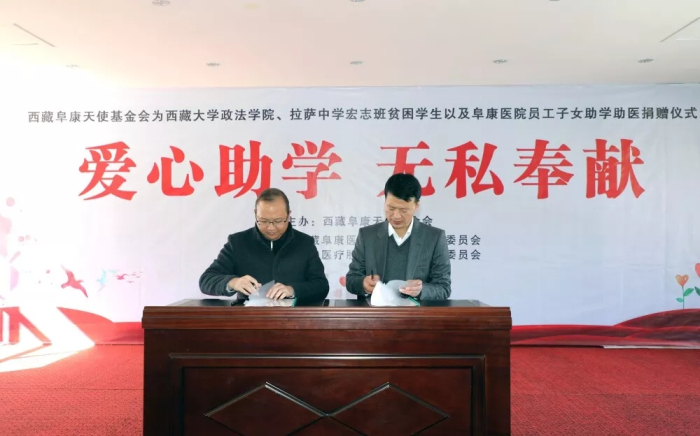西藏阜康天使基金會(huì)理事長(zhǎng)、西藏阜康醫(yī)療股份有限公司黨委書記、董事長(zhǎng)王斌與拉薩中學(xué)校長(zhǎng)陳飛簽訂捐助協(xié)議