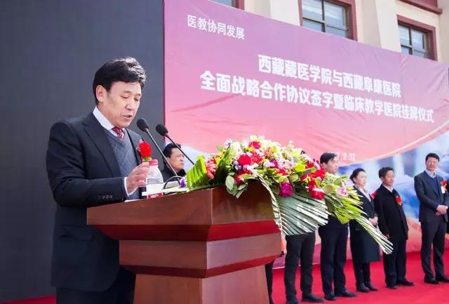 隨后,王斌董事長(zhǎng)在儀式中發(fā)表講話,全面介紹了西藏藏醫(yī)學(xué)院及西藏阜康醫(yī)院的發(fā)展歷程,并表示西藏藏醫(yī)學(xué)院和西藏阜康醫(yī)院達(dá)成全面戰(zhàn)略合作,旨在進(jìn)一步加強(qiáng)雙方戰(zhàn)略合作關(guān)系,雙方將在良好的合作和互信基礎(chǔ)上,本著“優(yōu)勢(shì)互補(bǔ)、資源共享、互惠互利、合作共贏”的原則,重點(diǎn)在人才培養(yǎng)、科學(xué)研究、學(xué)科建設(shè)、醫(yī)療服務(wù)等方面開展長(zhǎng)期合作,提升雙方在醫(yī)療、科研、人才培養(yǎng)及社會(huì)服務(wù)等方面的綜合水平;王斌董事長(zhǎng)還表示,為培養(yǎng)應(yīng)用型醫(yī)學(xué)人才,西藏阜康醫(yī)院特在西藏藏醫(yī)學(xué)院設(shè)立了30萬元助學(xué)、助教基金,用于幫助學(xué)習(xí)優(yōu)秀卻又家境貧寒的莘莘學(xué)子和鼓勵(lì)辛勤耕耘的優(yōu)秀教師。
