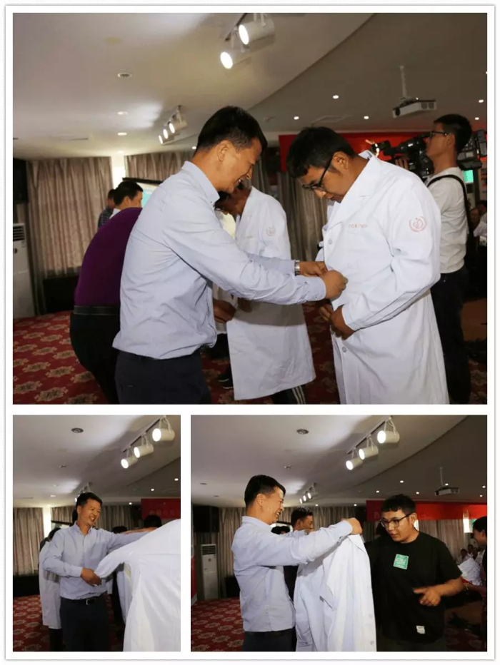 會議舉行了換裝儀式。王斌、陳彬、孫貴林、李君、李勇、何靜等院領(lǐng)導(dǎo)為醫(yī)師代表換上整潔的新式白大褂,向醫(yī)師代表贈(zèng)送了首屆醫(yī)師節(jié)紀(jì)念禮物;汪麗、李勇、徐勝柱、扇敏娜、李生隆等一起為全體醫(yī)師分發(fā)慶祝蛋糕,讓每一位在場醫(yī)務(wù)人員品嘗到濃濃的節(jié)日甜蜜。