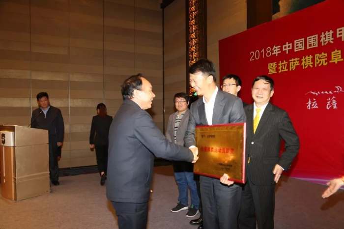 為表彰拉薩棋院阜康職業(yè)圍棋隊(duì)對(duì)西藏體育圍棋事業(yè)做出的巨大貢獻(xiàn),西藏自治區(qū)黨委副書記、主席齊扎拉代表黨委政府向拉薩棋院阜康職業(yè)圍棋隊(duì)領(lǐng)隊(duì)王斌頒發(fā)了“西藏自治區(qū)體育棋類貢獻(xiàn)獎(jiǎng)”!肯定了阜康四年來支持拉薩棋院積極參與全國各項(xiàng)賽事并為圍棋在西藏的普及發(fā)展所做出的諸多工作。勉勵(lì)王斌繼續(xù)支持西藏的圍棋發(fā)展,一步一個(gè)腳印地做好醫(yī)療衛(wèi)生和體育文化工作。
