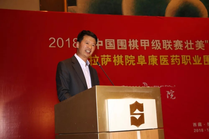 西藏自治區(qū)政府副主席甲熱·洛桑旦增代表自治區(qū)人民政府對(duì)各位嘉賓的到來表示熱烈歡迎。他說圍棋是一切棋類運(yùn)動(dòng)的鼻祖,是中華民族優(yōu)秀傳統(tǒng)文化的瑰寶,融合了軍事、哲學(xué)、詩詞等多種文藝形式,是中華民族幾千年來智慧的結(jié)晶,也是對(duì)人類文明的重要貢獻(xiàn)。在建設(shè)社會(huì)主義文化強(qiáng)國、體育強(qiáng)國、實(shí)現(xiàn)中華民族偉大復(fù)興的中國夢(mèng)進(jìn)程中,圍棋這樣一項(xiàng)由文化融進(jìn)體育的智慧運(yùn)動(dòng)承擔(dān)著重要的歷史使命。拉薩棋院西藏阜康醫(yī)藥職業(yè)圍棋隊(duì)沖甲成功是西藏體育發(fā)展的重大突破,也是社會(huì)力量推動(dòng)體育事業(yè)發(fā)展的典范。為此我代表自治區(qū)人民政府對(duì)西藏阜康醫(yī)藥職業(yè)圍棋隊(duì)沖甲成功表示熱烈祝賀,對(duì)社會(huì)各界支持西藏體育事業(yè)發(fā)展表示感謝,自治區(qū)政府將加快推進(jìn)體育事業(yè)改革、做強(qiáng)做大體育產(chǎn)業(yè),促進(jìn)全區(qū)體育事業(yè)再上臺(tái)階。祝愿2018年中國圍棋甲級(jí)聯(lián)賽壯美“第三極”西藏專場(chǎng)取得成功,祝愿西藏阜康醫(yī)藥職業(yè)圍棋隊(duì)在明年的甲級(jí)聯(lián)賽中取得更好成績(jī)。