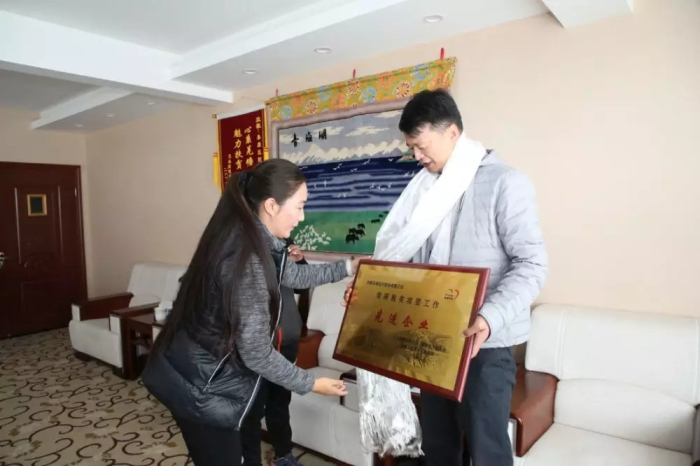 隨后,才旦卓嘎向阜康醫(yī)療股份有限公司黨委書記、董事長王斌頒發(fā)“脫貧攻堅(jiān)工作先進(jìn)企業(yè)”匾牌。