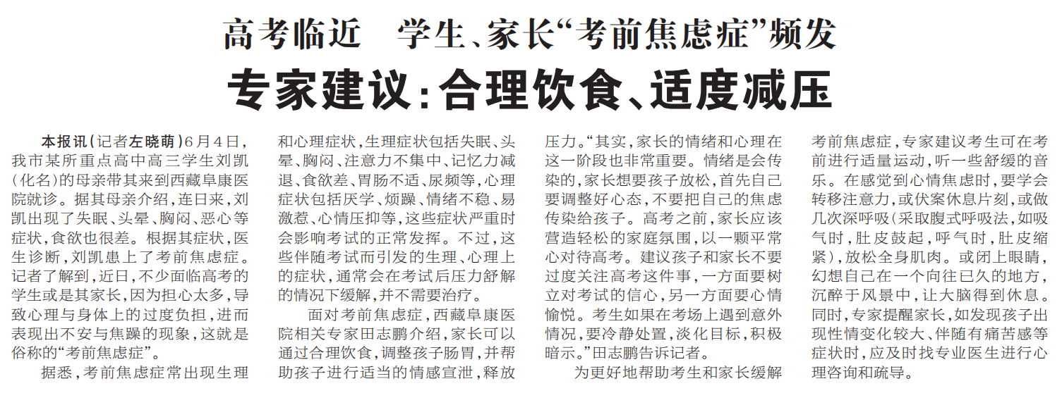 面對(duì)考前焦慮癥,西藏阜康醫(yī)院相關(guān)專(zhuān)家田志鵬介紹,家長(zhǎng)可以通過(guò)合理飲食,調(diào)整孩子腸胃,并幫助孩子進(jìn)行適當(dāng)?shù)那楦行?,釋放壓力?ldquo;其實(shí),家長(zhǎng)的情緒和心理在這一階段也非常重要。情緒是會(huì)傳染的,家長(zhǎng)想要孩子放松,首先自己要調(diào)整好心態(tài),不要把自己的焦慮傳染給孩子。高考之前,家長(zhǎng)應(yīng)該營(yíng)造輕松的家庭氛圍,以一顆平常心對(duì)待高考。建議孩子和家長(zhǎng)不要過(guò)度關(guān)注高考這件事,一方面要樹(shù)立對(duì)考試的信心,另一方面要心情愉悅??忌绻诳紙?chǎng)上遇到意外情況,要冷靜處置,淡化目標(biāo),積極暗示。”田志鵬告訴記者。
