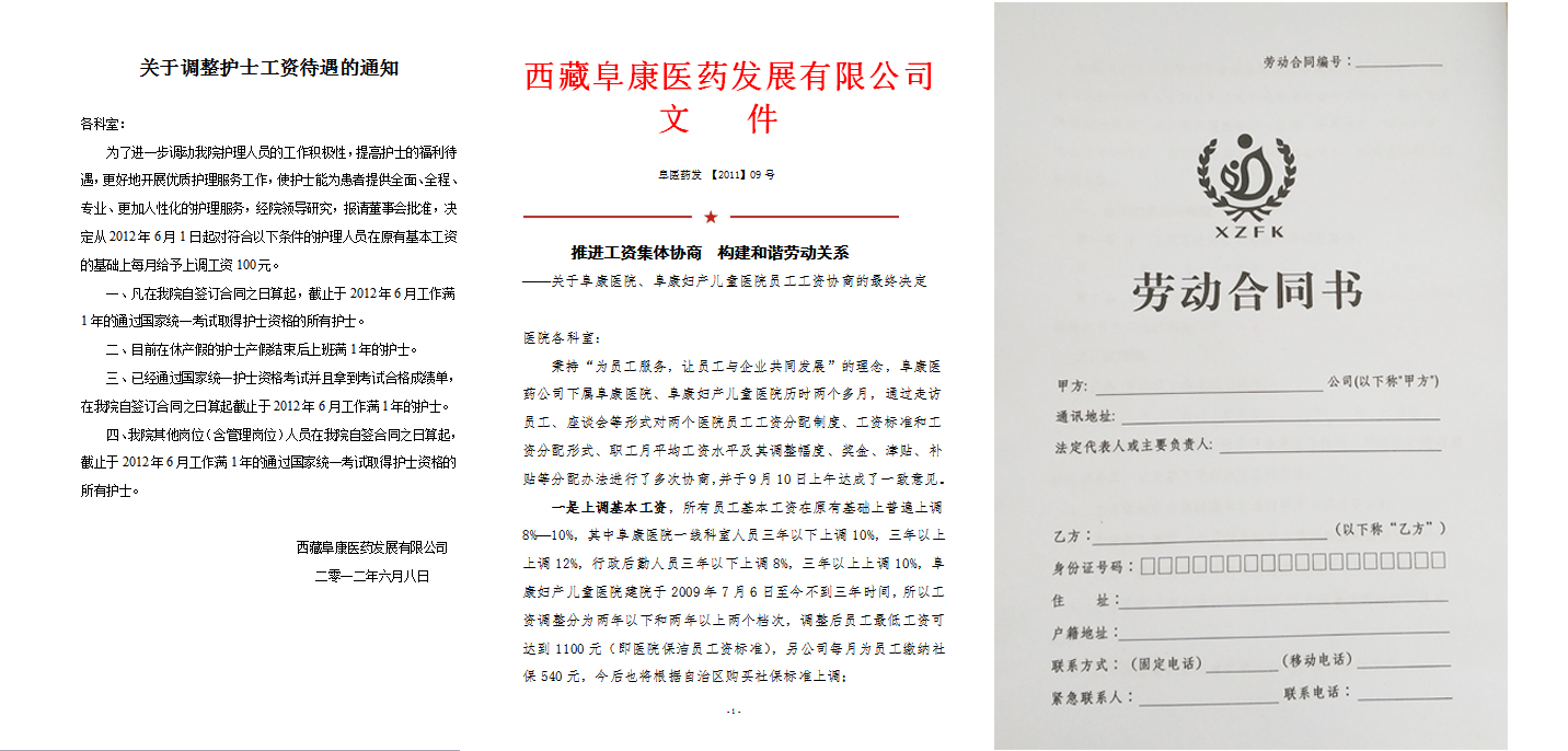 近年來,西藏阜康醫(yī)療股份有限公司高度重視工資集體協(xié)商工作,始終堅持以人為本,維護職工合法權益,認真貫徹《集體合同規(guī)定》。實行院務公開,發(fā)揮職代會作用,認真聽取員工在工資集體協(xié)商方面的意見和建議,根據(jù)需要召開職代會聯(lián)席會議,建立穩(wěn)定的分配機制和增資機制,保障了員工對公司工資分配的知情權、協(xié)商權和監(jiān)督權。認真履行《勞動合同》,設立了員工養(yǎng)老、醫(yī)療、工傷、生育、失業(yè)等保險,并足額上繳到位。