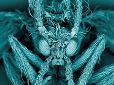 這是偽彩色處理的掃描電鏡下的毛蠓(moth fly,又稱蛾蠅)。這種蠅類的幼蟲習慣繾綣在人們家中的下水道里,時不時會從水槽里冒出來。毛蠓的軀體和翅膀上都覆被著微小的纖毛,所以看起來很像蛾子。
