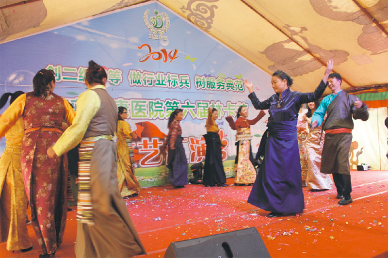 “阜康人的友情因相聚而濃烈,阜康人的夢(mèng)想因分享而永恒,阜康人的執(zhí)著因勇氣而堅(jiān)定,阜康人的感恩因摯愛而無限……”在主持人聲情并茂的報(bào)幕中,西藏阜康第六屆林卡文藝活動(dòng)拉開了帷幕。西藏阜康醫(yī)藥有限公司王斌董事長(zhǎng)致辭,表達(dá)了對(duì)林卡活動(dòng)這一企業(yè)文化的支持,并預(yù)祝活動(dòng)取得圓滿成功。文藝活動(dòng)的現(xiàn)場(chǎng),精彩紛呈,高潮迭起,有充滿了民族風(fēng)情的藏舞《酥油飄香》,有逗趣的民間曲藝《三句半》,有行云流水的古典舞蹈《青花瓷》,有英姿颯爽的跆搏操《Fighting》,有引人深思醫(yī)患小品《如此勸架》,有發(fā)自肺腑的演講《我心中的阜康》。還有一個(gè)特別節(jié)目,是我們西藏阜康醫(yī)院外一科的患者朋友曲英次仁自創(chuàng)自彈自唱的《致阜康醫(yī)生》,他尚未完全康復(fù),拄著雙拐上臺(tái)為我們帶來精彩的演出,這樣和諧的醫(yī)患關(guān)系也是我們今后努力的目標(biāo)。在文藝演出的間隙,還有穿插的小游戲,大家積極踴躍參與,臺(tái)上臺(tái)下其樂融融,賓主盡歡。林卡活動(dòng)一共進(jìn)行了兩天,中午的文藝活動(dòng)后是自助餐時(shí)間,下午則是員工們交流感情,自由活動(dòng)的時(shí)間。