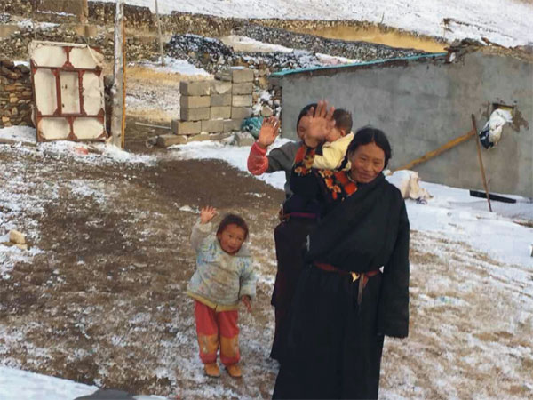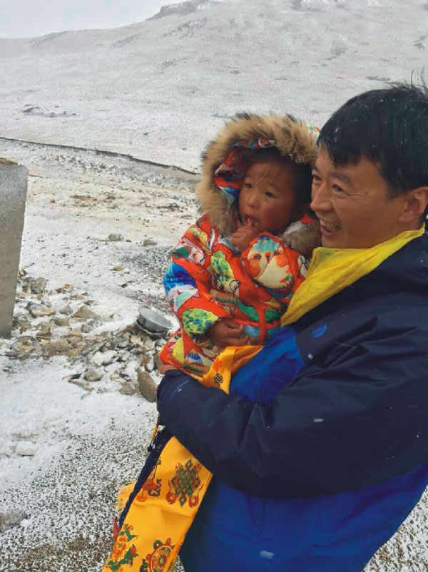 車(chē)子越來(lái)越近,透過(guò)車(chē)窗,遠(yuǎn)遠(yuǎn)白雪寒風(fēng)中,早已屹立著高矮大小幾人,是奶奶、媽媽、舅舅和天真的你,手捧著圣潔神圣的黃色哈達(dá),似盼望著許久不見(jiàn)的家人的歸來(lái),車(chē)外的寒風(fēng)很冷,有點(diǎn)刺骨。見(jiàn)到親人的到來(lái),奶奶急忙上前為他獻(xiàn)上祝福吉祥的哈達(dá)并雙手合十置于額上,隨后牽過(guò)身旁的女孩——玉康卓瑪,個(gè)子不高,比同齡孩子稍消瘦矮小,一張稚嫩的蘋(píng)果臉蛋兒上深深的高原紅,給人留下深刻印象。他滿懷憐愛(ài)地抱起了玉康卓瑪,年僅4歲的她并不會(huì)說(shuō)漢語(yǔ),更是未曾見(jiàn)過(guò)他,可愛(ài)害羞甚至有點(diǎn)怕生的小卓瑪卻對(duì)著他喊了聲“阿爸”。此時(shí),奶奶正在為次仁(我們同行的伙伴,是當(dāng)時(shí)參加玉樹(shù)抗震救災(zāi)且參與了接生小卓瑪?shù)淖o(hù)士之一)獻(xiàn)哈達(dá)。瞬間,空氣似乎凝固了幾秒,突然,奶奶兩行淚水徑直流了下來(lái)。此情此景觸人心懷,兩兩相擁,無(wú)聲地流著熱淚。是感恩,是親人,是多年來(lái)他一直履行承諾的感激,是為他不畏千里迢迢尋找來(lái)看望的感動(dòng),如同失散多年的親人再度相逢。