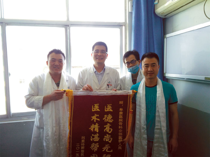 2015年5月23日,外一科收治一名來(lái)自曲樂鄉(xiāng)尼雄二村名叫扎西(化名)的病人,診斷為右脛骨開放性粉碎性骨折并大面積皮膚壞死,住院63天,共四次手術(shù)。因經(jīng)濟(jì)困難,無(wú)法承擔(dān)所欠的四萬(wàn)兩千余元。向上級(jí)領(lǐng)導(dǎo)匯報(bào)后,王斌董事長(zhǎng)指示:先治病,所欠費(fèi)用由雪域天使基金會(huì)補(bǔ)充。出院當(dāng)天,患者及家屬為我院骨科醫(yī)生獻(xiàn)上哈達(dá)和錦旗以表感謝之情。