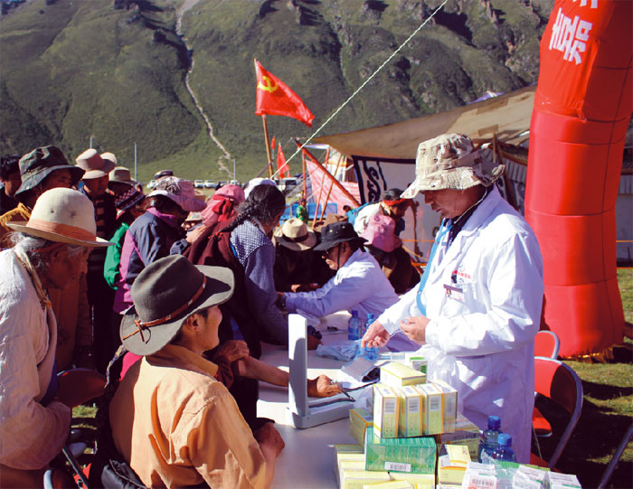 七月賽馬節(jié)期間,應嘉黎縣縣政府及申扎縣縣委縣政府的真誠邀請。2015年7月25日,西藏阜康醫(yī)院義診隊帶著醫(yī)院的囑托、8萬元的藥品分別向嘉黎縣、申扎縣出發(fā)。7月26日,賽馬場里人頭攢動,熱鬧非凡。在西藏阜康醫(yī)院義診點,在工作人員的維持下,大家排起了長隊,自覺有序地等待著專家給他們診治。專家們?yōu)槿罕姕y量血壓、診斷病情,耐心解答他們的提問,同時就高原常見病、多發(fā)病的防治知識進行了認真講解,增強了群眾的自我保健意識。