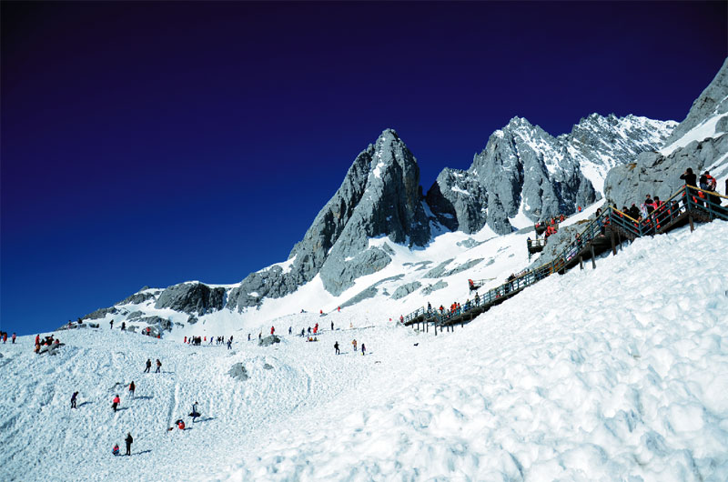 人文的掃興,索性來場自然之旅。第二天一大早我們就前往了玉龍雪山,還是被告知到達最高峰的索道票昨日售盡,我們的索道只到得了松杉坪?;貞浧饋恚@也許值得慶幸。松杉坪松樹高聳如云,木棧道旁有積雪未化,風過樹梢的積雪隨風灑落,偶爾有小松鼠一躍而過,牦牛悠閑自在的吃著草,遠處是玉龍雪山的最高峰,仿佛近在咫尺。我想所有的生生死死都應該在這里戛然而止,所有浮躁的靈魂都應該在這里接受洗禮,進入輪回,拋卻紅塵暫享這片刻的永生。她是我去過最接近天堂的地方,
