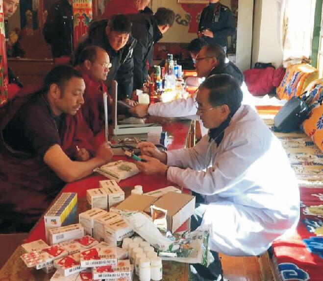 12月10日,在西藏阜康醫(yī)院名譽(yù)院長(zhǎng)、慢病管理中心主任張德才的帶領(lǐng)下一行6人前往楚布寺,義診中張?jiān)洪L(zhǎng)和田豐輝醫(yī)生負(fù)責(zé)測(cè)血壓,唐宗青測(cè)血糖,瓊瑪負(fù)責(zé)發(fā)放藥品,占堆對(duì)每一位血壓、血糖高的僧人、群眾進(jìn)行登記,張?jiān)洪L(zhǎng)根據(jù)西藏人民的生活健康狀況,對(duì)來(lái)義診人員提出《健康五大基石》。