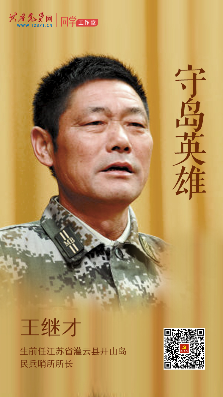 王繼才(1960—2018),江蘇灌云人。2003年10月加入中國共產(chǎn)黨。江蘇省灌云縣開山島民兵哨所原所長、開山島村黨支部原書記。自1986年起,毅然擔(dān)起守衛(wèi)黃海前哨開山島的重任。他和妻子以海島為家、與艱苦為伴,堅持每天升起國旗,每天按時巡島,護(hù)航標(biāo)、寫日志,與走私、偷渡等不法分子作斗爭。2018年7月27日,在執(zhí)勤期間突發(fā)疾病,經(jīng)搶救無效不幸去世。王繼才夫婦被評為全國“時代楷模”,王繼才后被追授為“全國優(yōu)秀共產(chǎn)黨員”。